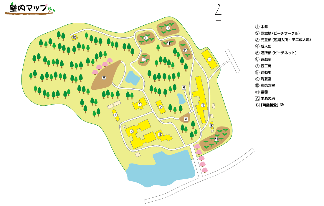 神楽池を左に見る南の進入路の桜並木から始まり、門を入り、遊戯室、児童部、教室棟、本館に向かう右手に鬱蒼と茂った木々と手入れされた庭木の間を緩やかな曲線を描く小道の両側に庭園は展開しています。
